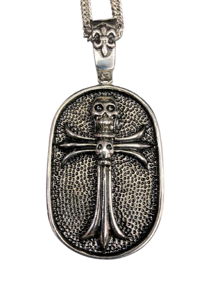 Este colar único combina elementos poderosos de estilo e simbolismo. O pingente em formato de tag apresenta uma cruz com dois crânios esculpidos, criando uma peça impactante. O design ousado faz desse acessório a escolha perfeita para quem busca expressar personalidade, rebeldia e um estilo marcante.