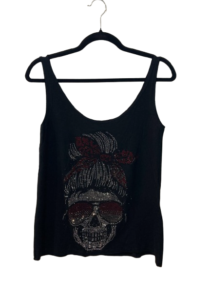 Mostre sua personalidade com essa regata preta feminina que mistura estilo alternativo e um toque divertido. A estampa traz uma caveira estilizada com coque, laço vermelho e óculos escuros, toda formada por pedraria brilhante que adiciona charme e destaque à peça.